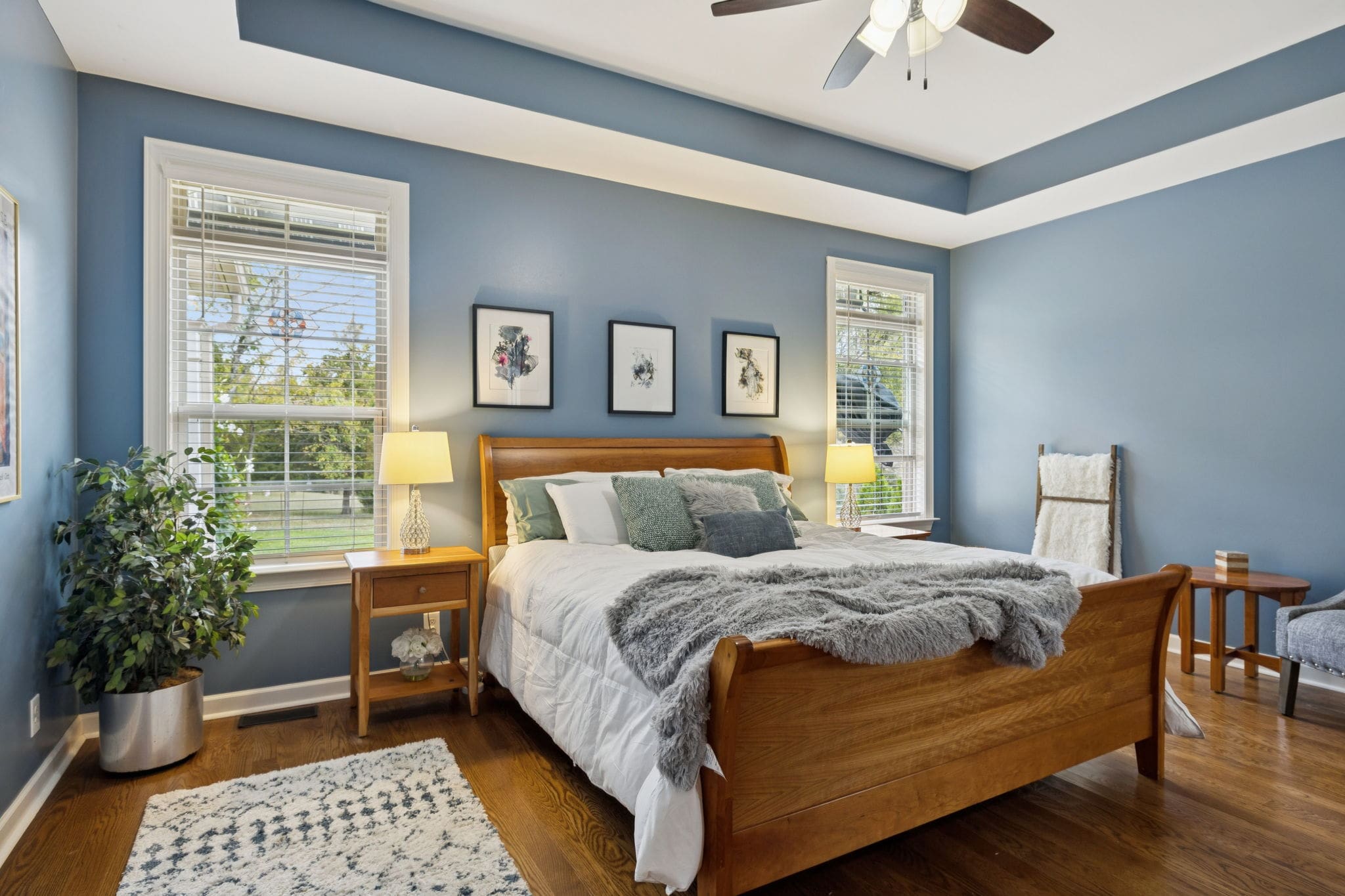The main level primary suite serves as a relaxing retreat with views of the backyard. The bath features updated sinks, mirrors, and fixtures along with a soaking tub and a separate shower. Generous closet space provides plenty of room for storage and organization. The room is spacious and bright, with enough area for a sitting space or reading chair and has a trey ceiling to compliment the room.