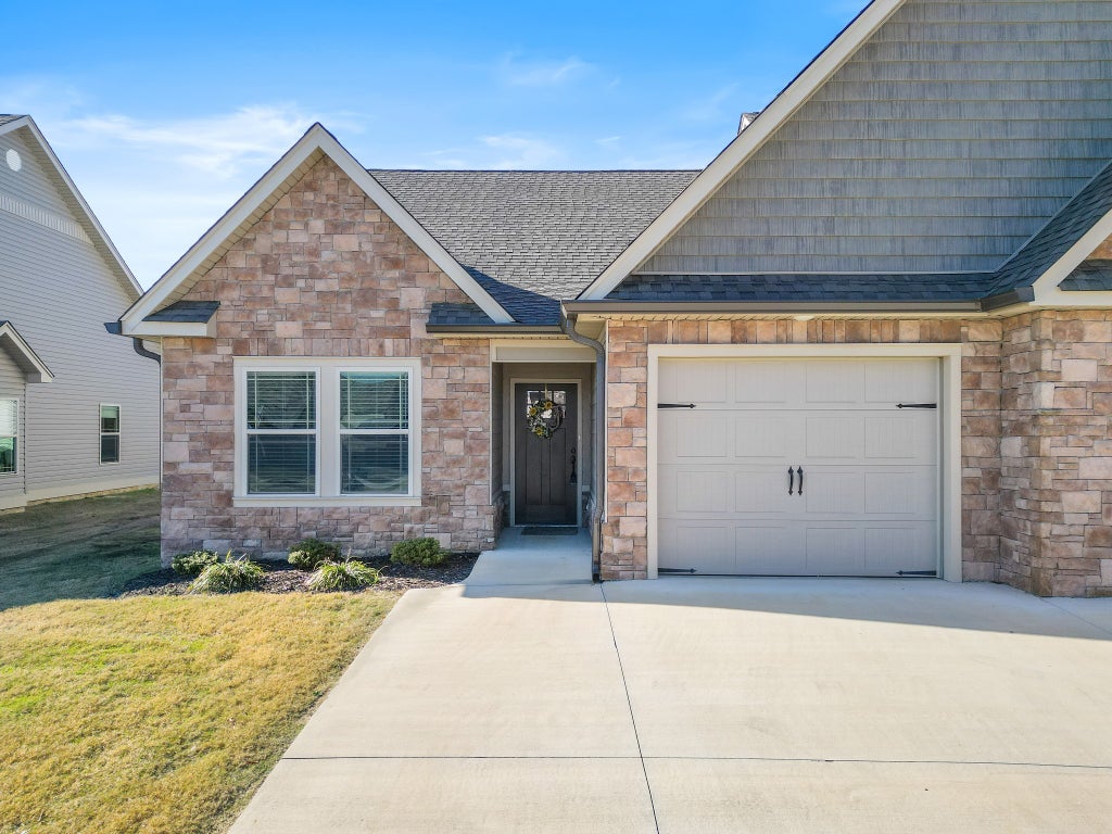 Built in 2023 and better than new! This one level, turnkey townhome is located in Sunset Cove's private, gated community, where you can live carefree knowing that the HOA covers all yard maintenance and more. This move-in ready home includes custom blinds, a brand new stainless steel fridge and even a flat screen tv, already mounted for you! The open layout between the kitchen and living room allows for tons of natural sunlight throughout. The covered, private porch offers a serene outdoor experience. All bedrooms are on the main level with a finished staircase to your oversized storage area upstairs. Park out of the cold in your one car garage. This quiet neighborhood is located just minutes from shopping all for your convenience! This is the home you've been waiting for!