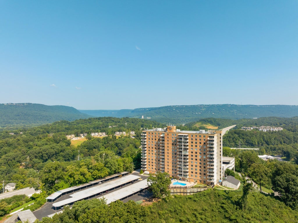 3 bedroom, 2 bath unit with mountain views in the desirable gated Pinnacle condo community just minutes from the North Shore and downtown Chattanooga. This 7th floor unit has tons of potential and is just waiting for the new owner to come in and make it their own. The unit offers hardwood floors, new vinyl windows and balcony door, crown moldings, granite countertops, an open floor plan, views from every bedroom, and comes with 2 parking spaces. The floor plan features a dedicated foyer with 2 closets and access to the kitchen and central hallway. The kitchen has a double sink, granite countertops, stainless appliances and adjoins the dining and living rooms. The living room boasts wonderful natural lighting due to the oversized sliding glass door to the covered balcony which provides a nice flow for everyday living or entertaining with the scenic setting as your backdrop. The primary bedroom is at the opposite end of the unit and has a walk-in closet with built-in shelving and a private bath. Two additional bedrooms share the use of the full hall guest bath. All of this, and the secured building offers a pool, club room, fitness center, theater room and is scheduled to get 2 new elevators and new paint in the lobby soon, so please call for more information and to schedule your private showing today. Information is deemed reliable but not guaranteed. Buyer to verify any and all information they deem important.