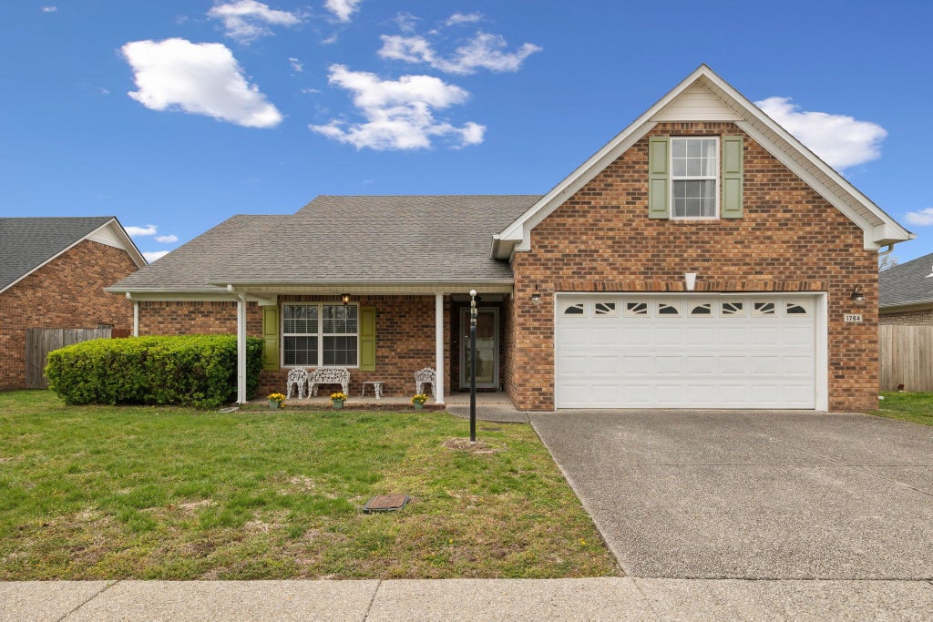 NEW PRICE. This charming brick home offers a welcoming covered front porch with decorative seating, lush green shutters, and a two-car garage. Step inside to a bright and airy living space featuring vaulted ceilings, a cozy fireplace, and an open-concept layout. The spacious living room flows seamlessly into the dining area, which is filled with natural light from large windows and offers easy access to the backyard. The kitchen is designed for functionality, with crisp white cabinetry, a breakfast bar, and ample counter space. A built-in desk area adds a practical touch. The primary suite is generously sized, with an en-suite bath and plenty of closet space. Additional bedrooms provide flexibility for guests, an office, or a hobby space. Enjoy outdoor living in the fenced backyard, complete with a patio area perfect for relaxing or entertaining. With its comfortable layout and desirable location, this home is a fantastic opportunity!