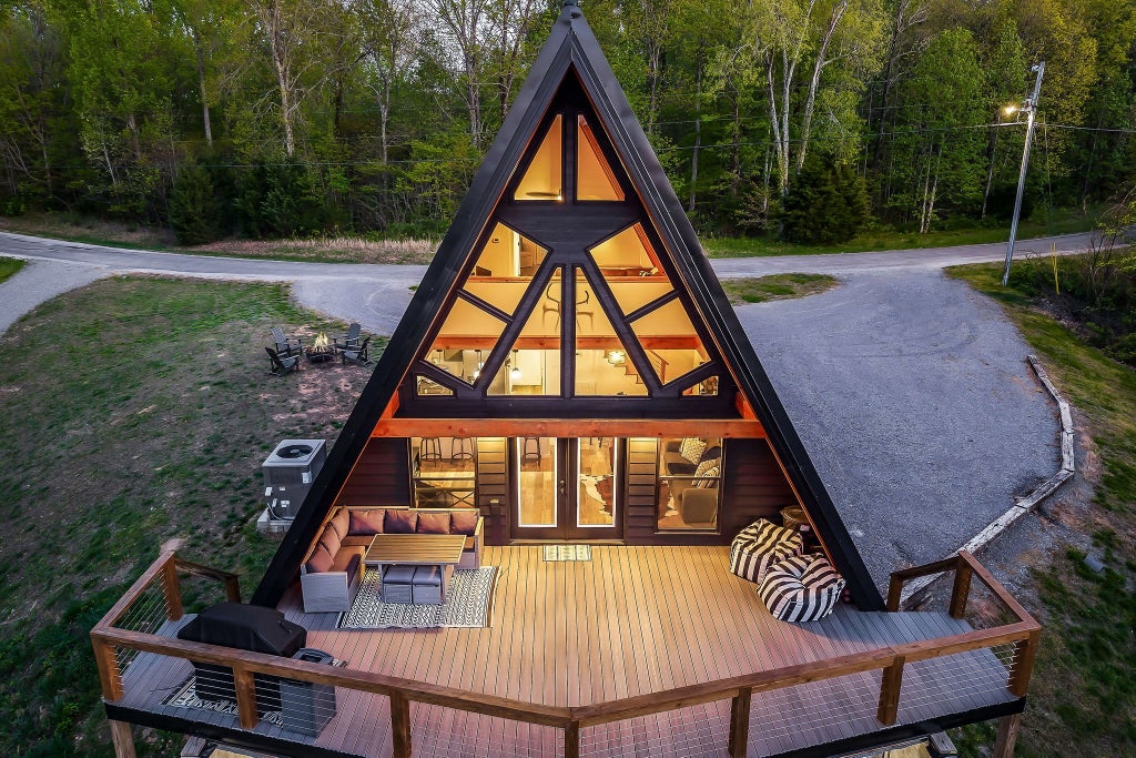 ESCAPE to your DREAM RETREAT with this beautifully crafted A-frame cabin nestled near the shores of Center Hill Lake. Custom-built with a modern luxe lodge experience in mind, this 3-bedroom 1.5-bath cabin offers the perfect blend of rustic charm and modern convenience creating the serene sense of hygge. Step inside to find an inviting open-concept living space with soaring vaulted ceilings, warm wood textures and oversized windows that fill the home with natural light and showcase the stunning views of surrounding woods.The quaint gourmet kitchen features custom cabinetry, gas range, black granite countertops and flows seamlessly into the dining and living areas — perfect for cozy nights or entertaining guests. Upstairs you’ll find a spacious loft-style entertaining area overlooking the main living room along with a hideaway bunk, half bath and gorgeous private bedroom with private balcony. Perfect to entertain friends and family. Enjoy your morning coffee or evening beverages on the expansive deck or fire pit area, all surrounded by the peace and quiet of nature. Need room to PARK your RV or even charge? This cabin has been setup with a 50 amp hookup to the side of the cabin! Also the cabin has been wired for a hot tub when you are ready. Whether you're looking for a weekend getaway, vacation rental, or full-time residence, this cabin offers the tranquility and charm you’ve been searching for along with a proven track record of Airbnb income! Located just minutes from Center Hill Lake, Hidden Harbor Marina, historic downtown Smithville TN, local restaurants and more— your lakeside lifestyle awaits with endless possibilities to start renting or spend as your own oasis.