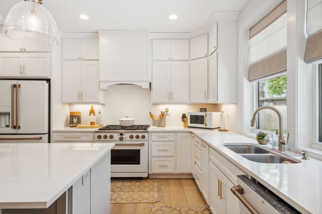 Inside, you're immediately greeted by an abundance of natural light pouring in through oversized windows, creating an instant mood boost. The living room is anchored by a stunning chandelier, while the kitchen features an abundance of floor to ceiling custom cabinetry, high end finishes, and top of the line GE CAFE brand appliances - absolutely GORGEOUS! You'll never run out of storage. There's even a utility room w/ extra entry off of the kitchen convenient to additional parking.