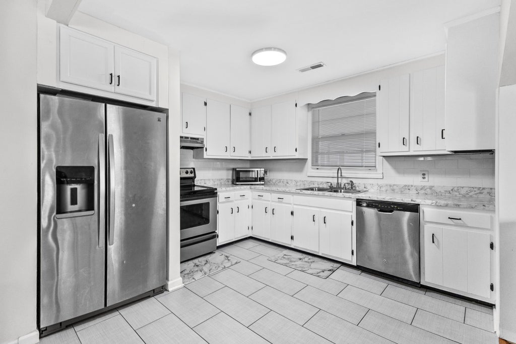 The main level features a nicely updated kitchen with stainless appliances, modern countertops, flooring and refreshed cabinets w/ample prep space, and a seamless flow into the dining and living areas—making everyday living and entertaining easy and enjoyable, while 2 bedrooms and a full hallway bath complete the front side of the main floor.
