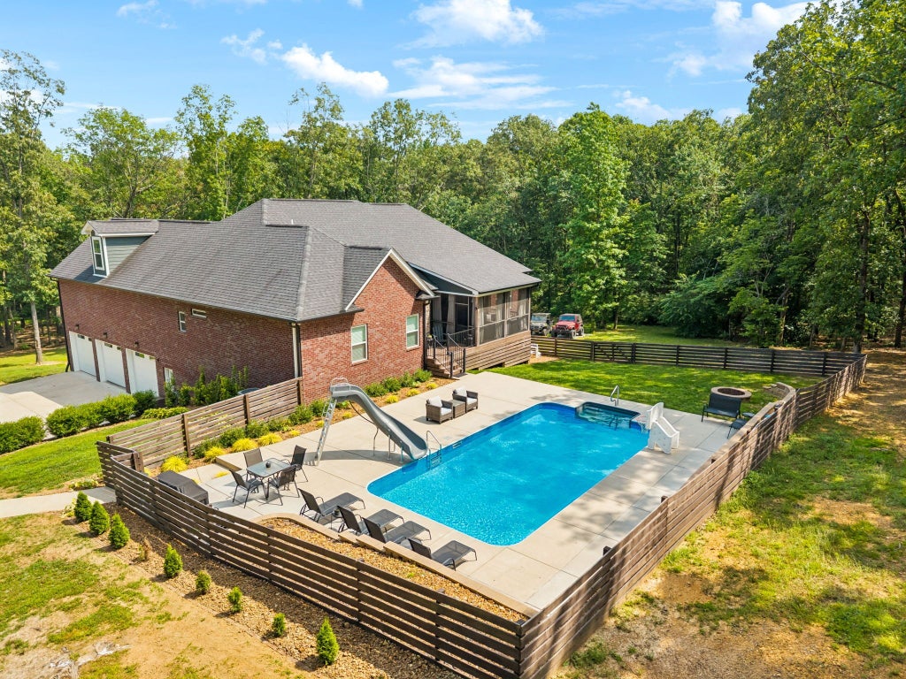 Receive a lender credit when you use seller's suggested lender! Welcome to this exceptional custom-built luxury home nestled on over 12 scenic acres of wooded beauty, complete with ATV trails and unmatched privacy—just minutes from shopping, dining, and all that Dickson has to offer. This thoughtfully designed 4-bedroom, 4.5-bath home offers the perfect blend of modern elegance and traditional charm. Step inside to an open floor plan featuring hardwood floors throughout the main level, tile in all bathrooms, and zero carpet. All bedrooms are conveniently located on the main floor, including a stunning primary suite with a spa-like ensuite bath—featuring double vanities, a makeup vanity, an oversized tiled walk-in shower, and a spacious walk-in closet. The heart of the home is the gourmet kitchen, outfitted with custom cabinetry, granite countertops, a double oven, stainless steel appliances, and ample space for entertaining in the formal dining room, breakfast room, and large living area with a gas fireplace. A dedicated office (which can serve as a fifth bedroom), hidden theater room, and a secret door leading to a finished basement with kitchenette, living area, and full bath add to the home’s luxurious amenities. Upstairs offers an additional flex room—perfect for a guest room, hobby space, or private retreat with built-in storage. Outdoors, relax on the covered front porch or the expansive covered back deck overlooking a fenced-in backyard and a stunning inground pool with a large slide. The property also boasts two firepits, ideal for cozy nights. Car enthusiasts and fitness lovers will appreciate the heated 3-car garage with soaring 19.5' ceilings, complete with a basketball goal and gym area, plus an additional 2-car garage on the opposite side of the home. This one-of-a-kind property offers the perfect combination of luxury, functionality, and outdoor recreation. Come experience refined country living—your dream home awaits.