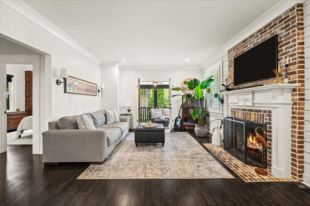 Set on a large lot with a fenced yard, privacy is an everyday luxury. Inside, the spacious living room welcomes you with a massive brick gas fireplace and French doors that open to a screened-in porch—perfect for year-round relaxing and entertaining. The fireplace's intricate mantle, arched hallways, and high-end lighting fixtures add timeless character throughout.
