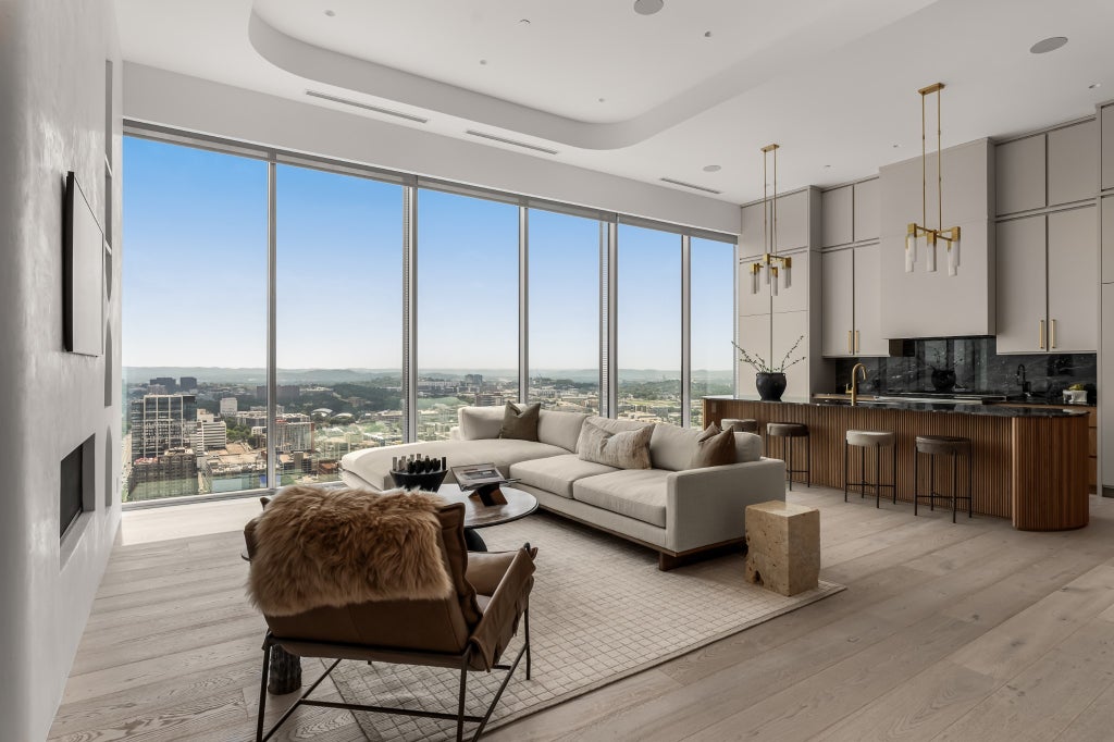 Welcome to this one of a kind furnished multi-million dollar custom luxury penthouse at The Residences at Broadwest, meticulously designed by Oxford Shepard. Featuring 3 bedrooms + office & 3.5 bathrooms, this penthouse has never been lived in and meticulously crafted to offer the utmost in comfort and refinement. The grand living area is highlighted by a beautiful plaster double-sided fireplace and striking white-oaked curved walls, creating a seamless blend of elegance and warmth. Soaring 13-foot ceilings further enhance the sense of spaciousness and grandeur. The primary suite is a luxurious retreat, complete with an expansive shower, a deep soaking tub, and a separate make up vanity, ensuring a spa-like experience at home. From every room, you’ll enjoy breathtaking panoramic views of Nashville’s rolling hills and the picturesque sunsets over Vanderbilt University. Seize the rare chance to own a piece of Nashville’s elite real estate, where elegance and exclusivity converge.