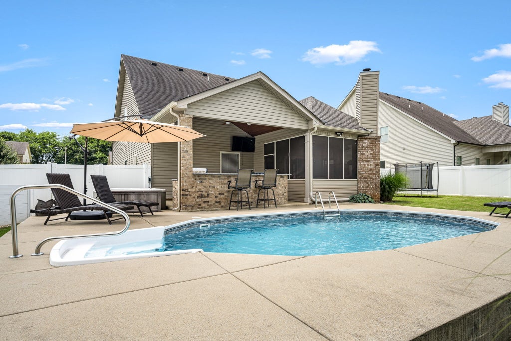 Well-maintained 3-bedroom home located on the west side of Murfreesboro. Each bedroom includes an oversized walk-in closet, offering ample storage space. A large bonus room provides flexible use as a home office or media room. The kitchen is well appointed with abundant cabinet storage, offering functionality and style for everyday use. Refrigerator, washer, and dryer are included—making this home truly move-in ready. The screened-in rear porch features a wood-burning fireplace, creating a comfortable space to relax year-round. Enjoy the 18x36 in-ground pool and separate hot tub, perfect for both entertaining and daily enjoyment. A recently added $40,000 open A-frame patio includes an outdoor kitchen with a Blackstone grill and Weber gas grill—ideal for outdoor dining and gatherings. BRAND new roof and HVAC is only 2 years old! Located in a sidewalk-lined community with access to a neighborhood pool as well!