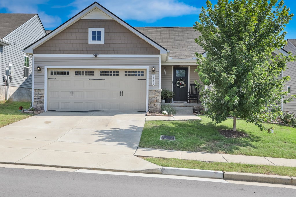 Welcome to this beautifully maintained 3-bedroom, 2-bath home in the Thornton Grove community! Built in 2021, this single-level cottage-style residence features an upgraded stone-accented façade, open-concept living, and a spacious great room. Enjoy a modern kitchen with quartz countertops, stainless steel appliances, and upgraded cabinetry. The primary suite offers a walk-in closet and private bath. Additional highlights include luxury vinyl plank flooring, a smart thermostat, and a 2-car attached garage. Fully sodded yard. Conveniently located near I-24, downtown Nashville, and local amenities—this home is move-in ready!