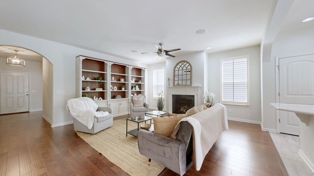 Outside, you'll find a fenced, petite backyard with a patio and a partial wrap-around front porch, perfect for outdoor gatherings. The community amenities are equally impressive, with access to a communal pool, tennis court, gym, walking trails, and clubhouse. Central AC and heating with new duct work throughout to ensure year-round comfort, while the electric dryer hookup and washer add convenience. Features to not miss - tankless hot water heat, whole home audio system, natural gas piping for outdoor gas grill, elegant, softly rounded archways, tons of storage, comfort height toilets, and much more.