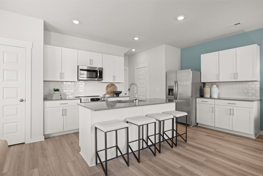 LOT 157 - Harper Floorplan. This new two-story townhome design combines comfort and style. The first floor features an open-concept layout connecting a living room for shared moments, a dining room for memorable meals and a kitchen for inspired cooks. Nearby sliding glass doors provide access to a covered patio for outdoor enjoyment. On the second floor, two secondary bedrooms and a spacious owner’s suite with a luxe bathroom and large walk-in closet provide restful retreats for family members and overnight guests. *Images from a furnished model of this home. Actual configuration and features may vary.