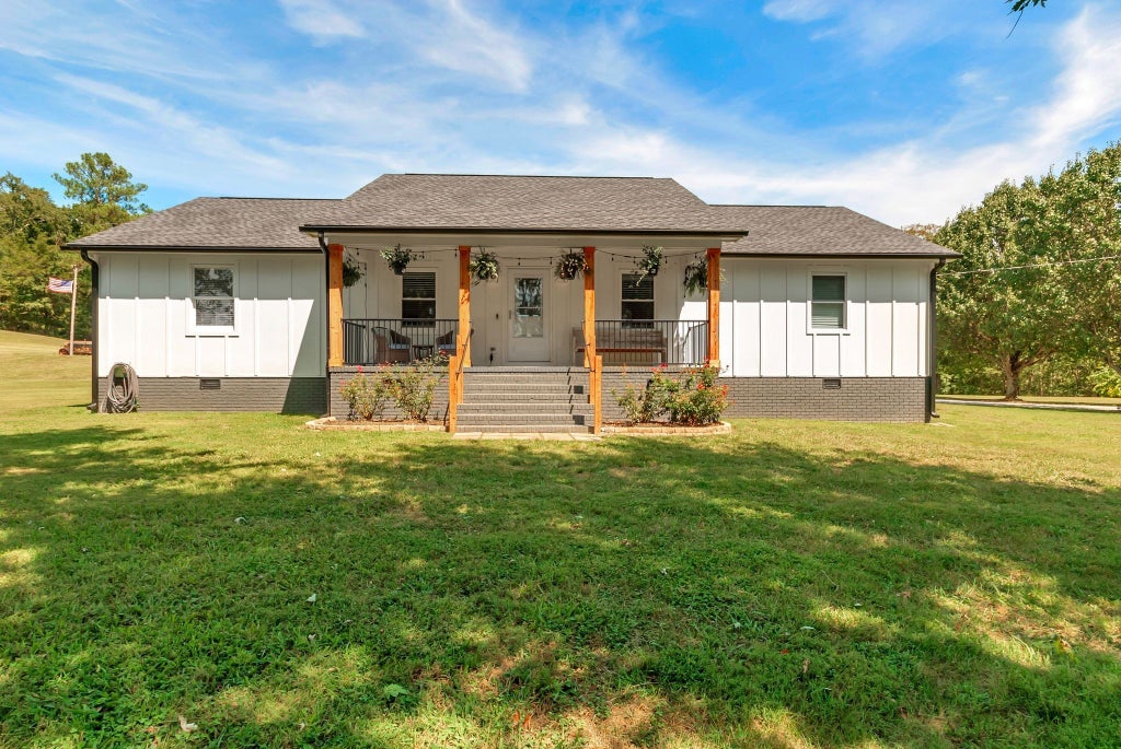 PRICE IMPROVEMENT!! Enjoy sweeping long-distance views from this private hilltop mini farm, featuring comfortable one-level living, situated on 20.45 acres of open pasture and mature hardwoods. This charming home offers a bright, open floor plan and a peaceful setting that's ideal for relaxed country living. In addition to the main home, the property includes a detached 900 sq ft garage with workshop, a rustic cedar and oak pole barn, and a seasonal creek (Hardy Branch) that adds to the natural appeal. Inside the home you will find plenty of room to relax in the large great room which opens to kitchen where you will find granite countertops, tile backsplash, SS appliances including a range with double ovens, spacious dining area, plus 4 bedrooms, 2 full baths and utility room. Recent improvements, include a new roof, gutters with LeafGuard technology, James Hardie board and batten cement siding, windows, carpet, and freshly painted interior. Both bathrooms were beautifully updated with quartz countertops, lighting, mirrors, and fixtures. Laminate flooring runs throughout the main living areas and hallway, offering durability and easy maintenance. The front porch is enhanced with cedar-wrapped columns and updated railing, and the deck is freshly stained and finished with cedar post and new railing. From the tranquil front porch where you will enjoy breathtaking sunsets, to the carefully completed upgrades throughout, this hilltop retreat is ready to welcome you home.