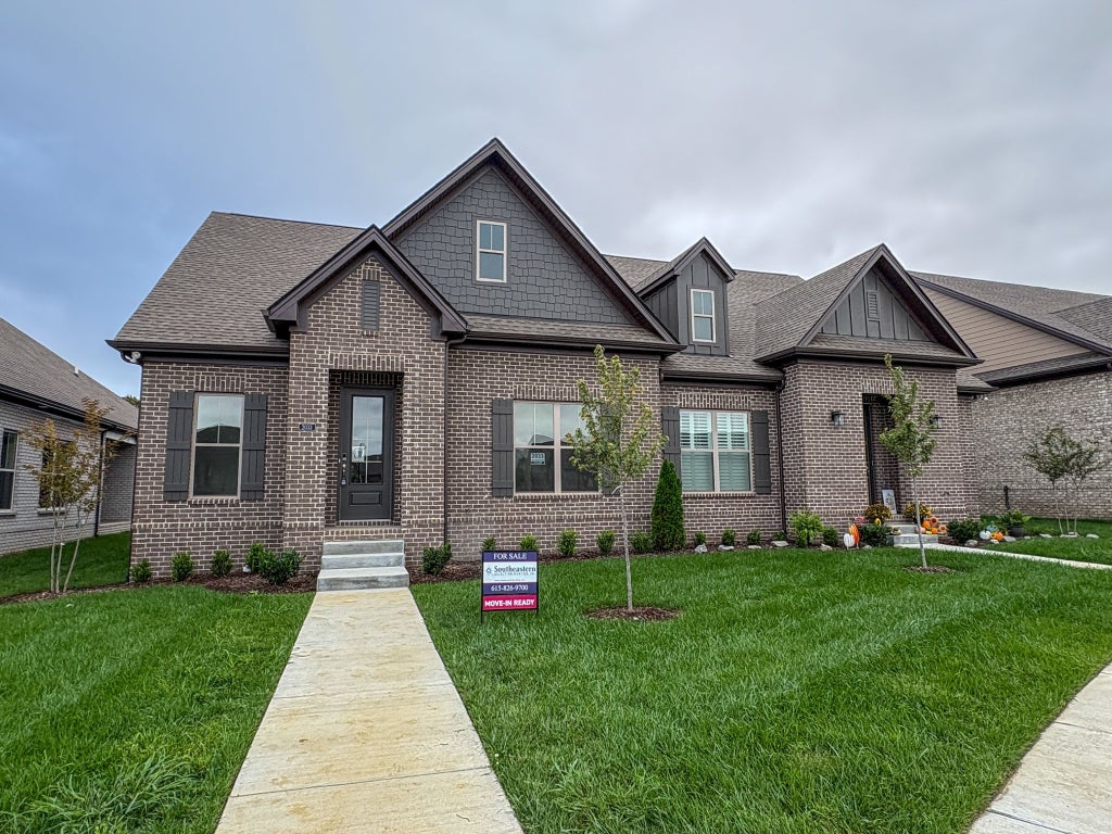 Enjoy one-level living in the Grant floor plan at The Paddock at Kennesaw Farms! This all-brick, 2-bedroom, 2-bath home offers 1,689 sq ft of thoughtfully designed space. The selections package features luxury laminate flooring in main areas, plush carpet in bedrooms, and designer tile in baths. The open-concept layout includes a spacious living room with gas fireplace, a formal dining room, and a gourmet kitchen with quartz countertops, white cabinetry, a tile backsplash, stainless appliances, and an island. The primary suite boasts a walk-in closet and a private bath with quartz vanity and shower. Additional highlights include a flex room, wainscoting in the foyer, upgraded lighting, and a rear-entry 2-car garage. Stylish exterior details and full irrigation add curb appeal. Ask us about our preferred lender and seller incentives!