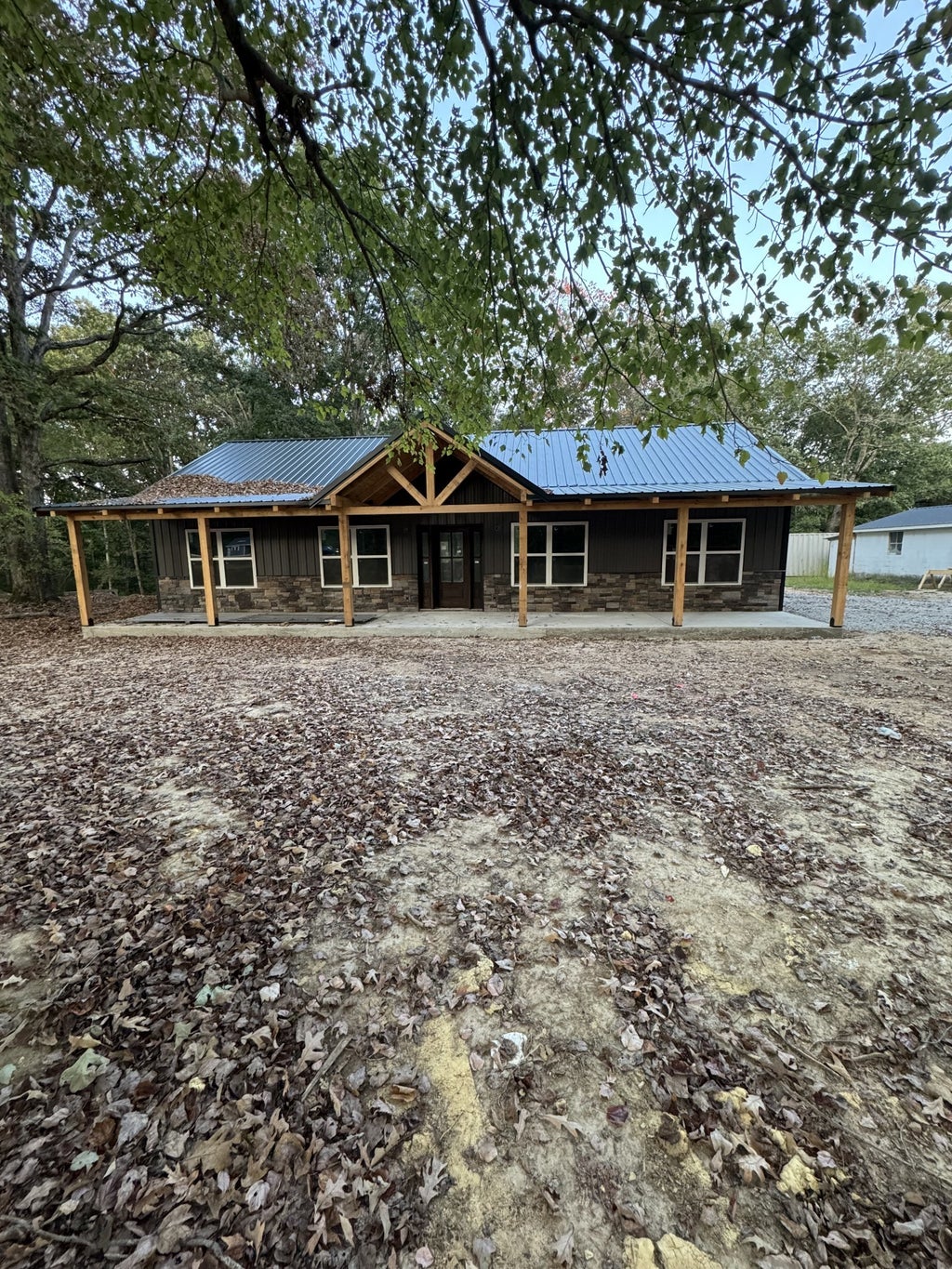 Welcome to your dream home! This beautifully designed 3-bedroom, 2-bathroom residence sits on a spacious 1-acre lot, offering a perfect blend of modern luxury and natural serenity. The home features elegant granite countertops in the kitchen, adding a touch of sophistication to the open-concept living space. With 415 sq ft of open front porch to enjoy the sunsets and outdoors Currently under construction, this property showcases high-quality finishes, including a stylish tiled bathroom with marble walls and a contemporary front door with glass panels. The exterior boasts a charming stone accent and metal siding, complemented by a covered porch ideal for enjoying the surrounding wooded landscape. Inside, the home includes ample cabinetry and a well-planned layout, perfect for family living or entertaining guests.