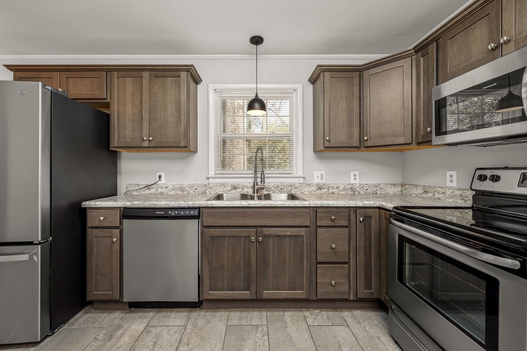 The renovated kitchen is the heart of the home, complete with stainless steel appliances, including new fridge. From here, you have a clear view into the eat-in kitchen, living room, entryway, hallway leading to the bedrooms, and the spacious bonus/rec room. This open sightline makes the kitchen feel like the "crow’s nest," perfect for keeping an eye on kids, pets, or guests while cooking.