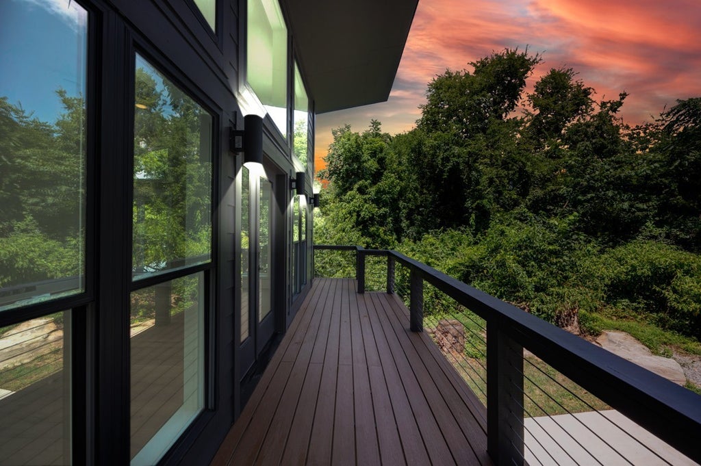 The upper-level unit is a modern 1-bedroom suite with a spa-inspired bathroom, custom walk-in closet, and an expansive living area with floor-to-ceiling windows. Its second full kitchen opens to a private deck, ideal for outdoor entertaining.