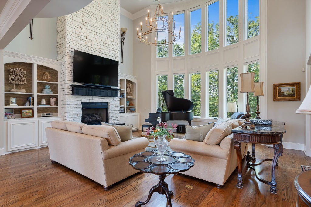 Welcome to this classic French Country style home nestled on a cul-de-sac in the gated community of Kings' Chapel. Inside you'll discover the curved staircase with Juliet Balcony that overlooks the 20' ceiling in the Great Room with a striking stacked stone fireplace and double rows of 6' tall windows with year-round sunset views. The open concept living includes a large kitchen with island, dining room and butler's pantry. The primary suite bath features a soaking tub, separate vanities, toilets, floor-to-ceiling tiled showers, and a walk-in closet with a laundry room nearby. The main level also includes a living area or office. Upstairs are two dedicated en suite bedrooms and the third room could be used as a bonus room or private en suite that includes a kitchenette and hookup for washer and dryer. The home also offers a walk-out finished basement and storage room. Enjoy outdoor living with a screened-in porch and deck overlooking the spacious backyard. Kings' Chapel residents enjoy tree-lined streets and over 350 acres of natural green space with walking trails, playground, and clubhouse with saltwater pool, fitness center, and restaurant. Zoned for award-winning schools and minutes from Franklin and the Interstate. Don't miss out on making this beautiful home your own.