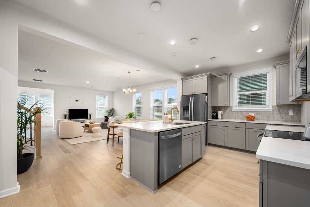 The open-concept floor plan centers on a chef’s kitchen with Whirlpool stainless appliances (including a microwave/air fryer combo), quartz counters, a large island, soft-close cabinetry, walk-in pantry, and tile backsplash. Seamlessly flow from the kitchen to the dining/living areas, perfect for everyday living or entertaining.
