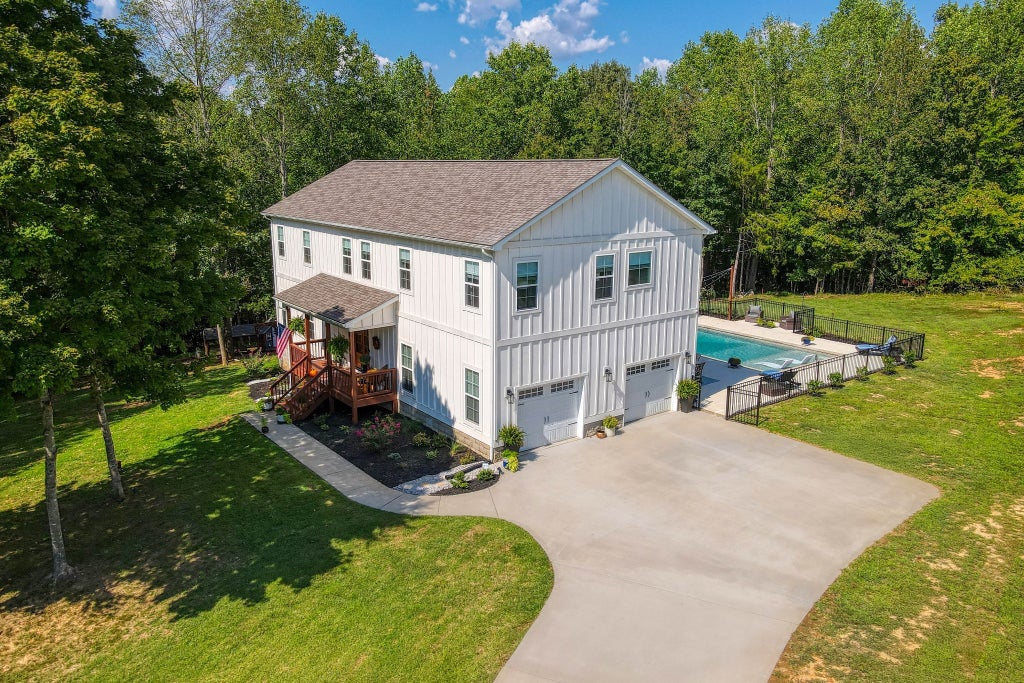 Like-new home with extensive updates in the past year. New front door with beveled glass. Open floor plan on main with huge updated kitchen featuring new appliances including Kucht gas range plus electric double ovens, new flooring, and backsplash. Great room with ventless gas fireplace, and view of pool deck. Master suite includes laundry, soaking tub, and huge separate shower. New light fixtures and custom blinds throughout the home, updated baths, updated wood flooring and new carpet upstairs. Den on balcony overlooking the living room includes a slate pool table. New stair spindles and refinished wood stair treads. Pool features beautiful sun deck. Serene locaton on 2+ acres with mature trees. Barn with loft offers lots of storage. Chicken coop with optional chickens. Just minutes from Cumberland River boat launches at Liberty Park and McCormac Landing.