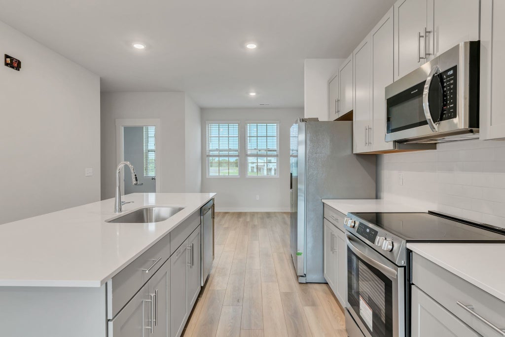 LOT #1030 - Gatlinburg. Upon entry into this new three-story townhome is a convenient two-car garage for storage space. On the second floor is the main living area, featuring an expansive Great Room with direct access to a modern kitchen and dining area. Residing on the top level are two bedroom suites situated at opposite ends of the home to grant privacy, both of which feature attached bathrooms for enhanced livability.