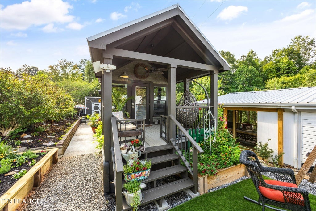 This tiny home may be small in size, but it's big on charm and upgrades! Every inch has been thoughtfully designed with style and function in mind. The modern kitchen is a true highlight, featuring full-size appliances, quartz countertops, and even a wine fridge, perfect for entertaining or just unwinding at the end of the day. Hardwood floors and sliding barn doors bring warmth and character throughout, while a whole-home water filtration system ensures fresh, clean water for everyday living. The bathroom is just as impressive with its walk-in shower and quartz counters, and the loft space upstairs comfortably fits a queen-size mattress making it a cozy retreat. Structurally, the home is anchored with metal straps and 4-ft augers, plus stabilizer bars at the front and back for maximum peace of mind. Step outside and you'll find a 10' x 12' storage building with electricity, also secured with metal strapping and augers, along with extensive landscaping that the seller has beautifully put in place. The inviting front porch is perfect for relaxing under the ceiling fan while neighbors cruise by on golf carts headed to the community pools, golf courses, tennis courts, or the pond, you might even catch a bear sighting! And here's the cherry on top: this property also includes the most adorable camper that's perfect for a guest house. It's cute, cozy, and makes the perfect little getaway spot for visiting friends and family.