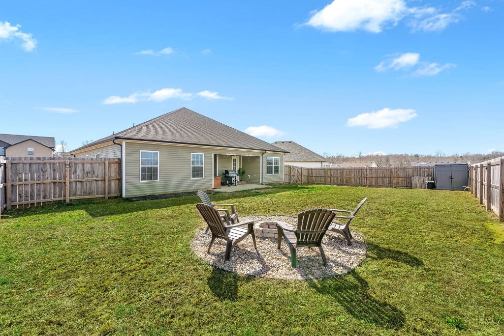 SELLER TO PROVIDE $5K IN CONCESSIONS! This beauty features vaulted ceilings, a shiplap fireplace, custom foyer paneling, and an open concept layout. The kitchen offers a large island, built-in bench, and a laundry room/pantry off to the side, boasting extra wood shelving and cabinets. The primary suite features double tray ceilings, a bright en suite bath with double vanities, and a huge walk-in closet! Two additional spacious bedrooms are nearby with a full bathroom in between. Enjoy a fenced backyard with a fire pit, covered patio, and small shed. Garage floor is epoxied! ASSUMABLE 5.75% VA LOAN!
